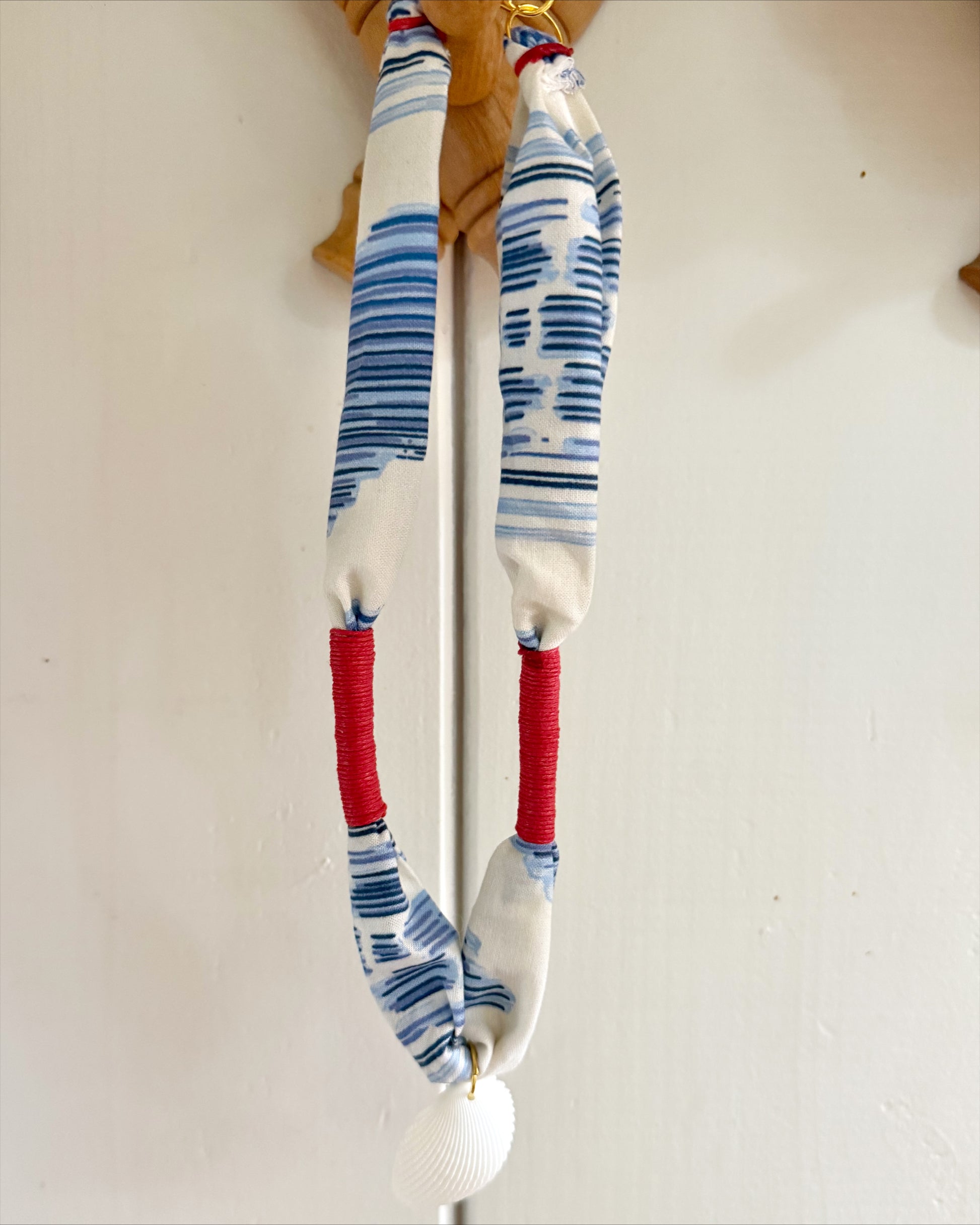 Summer statement necklace! Blue and white fabric wrapped in cord and topped with a beautiful shell! Love how this necklace elevates a simple outfit!
