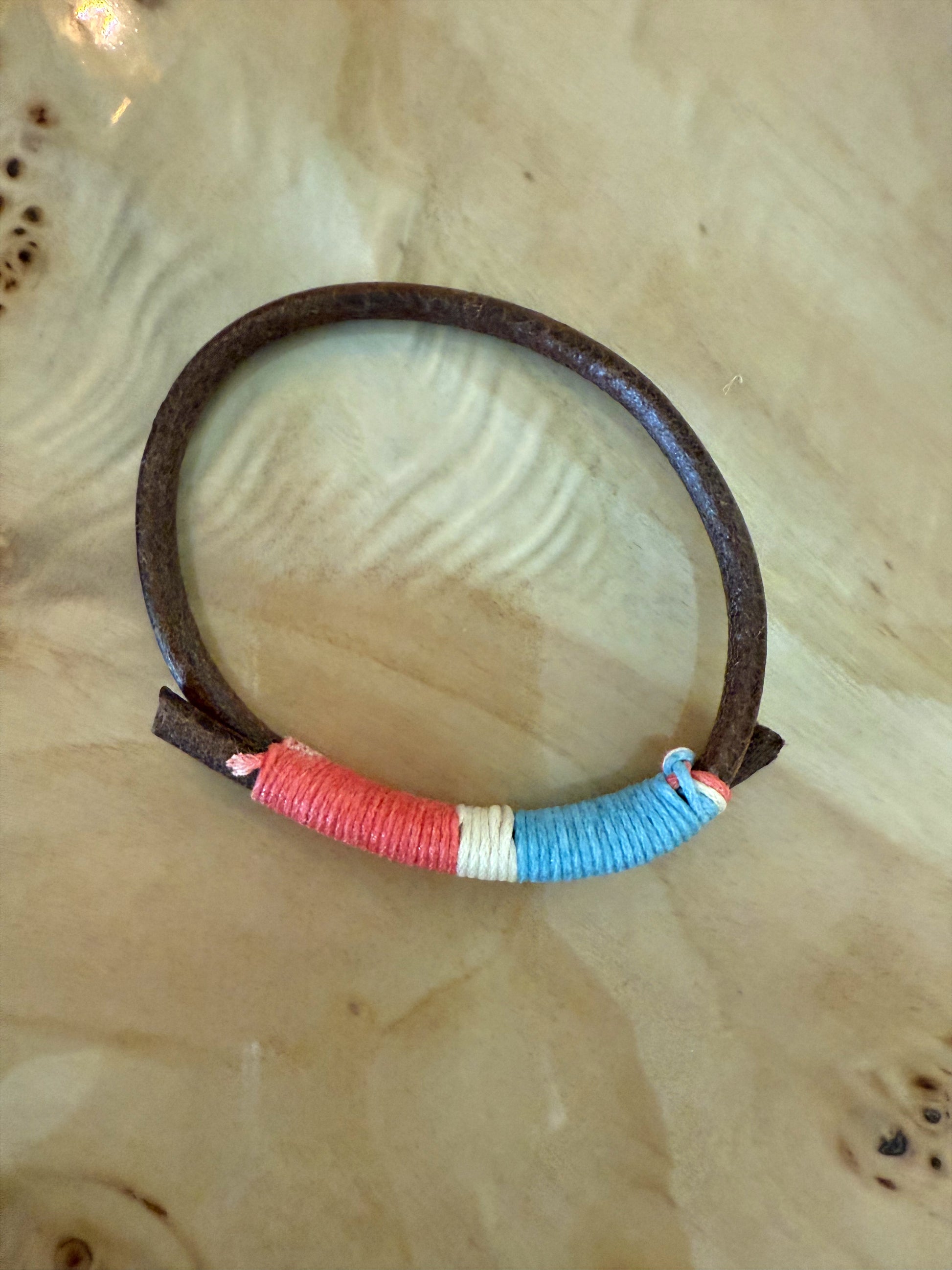 Brown leather leather wrapped with light blue, coral and cream cord!