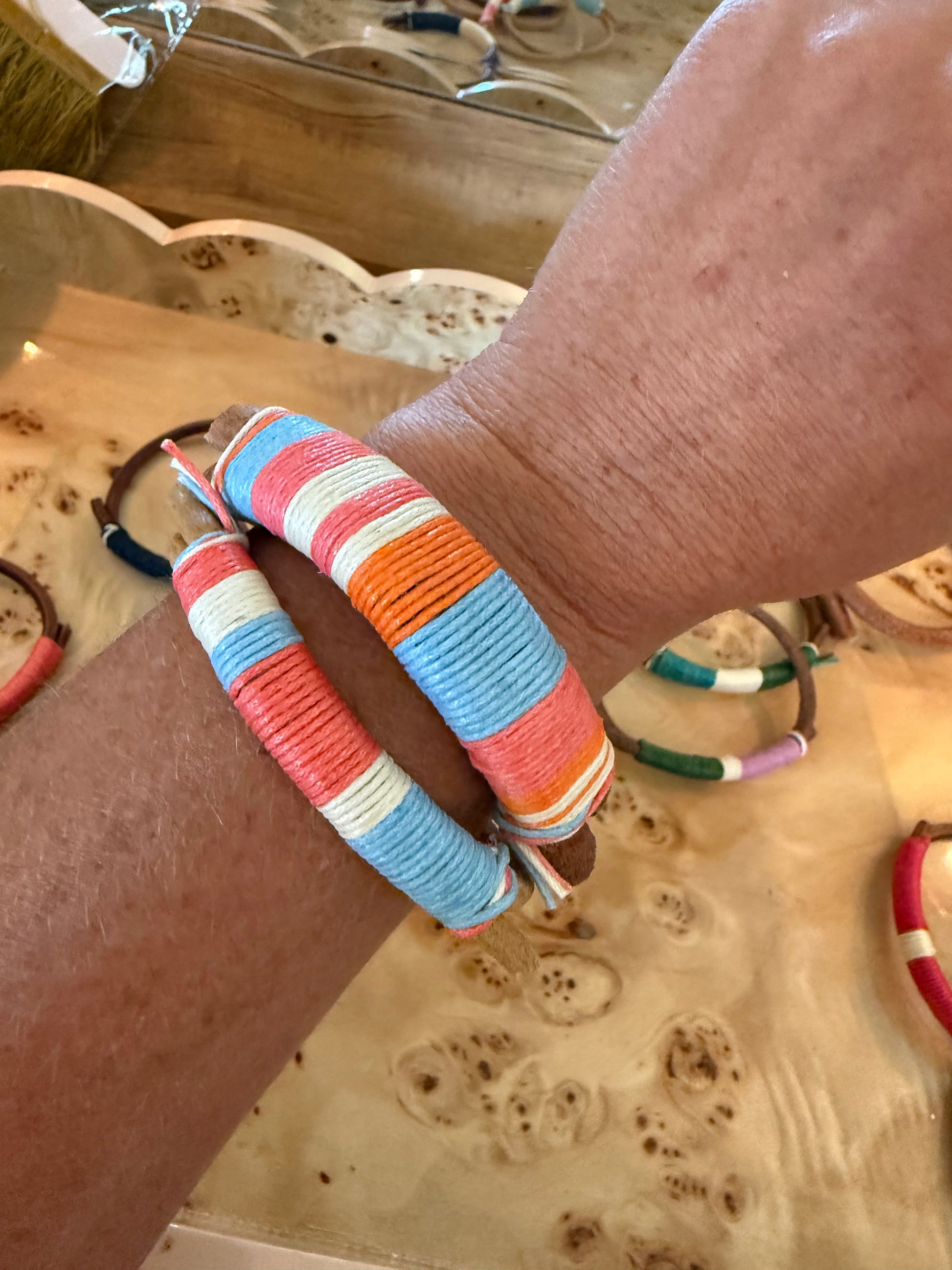 Brown leather leather wrapped with light blue, coral, orange and cream cord! This is the thicker size!